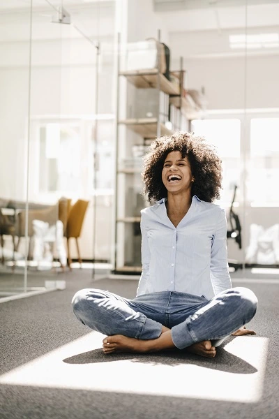 Engage in guided laughter, gradually building joy and relaxation.